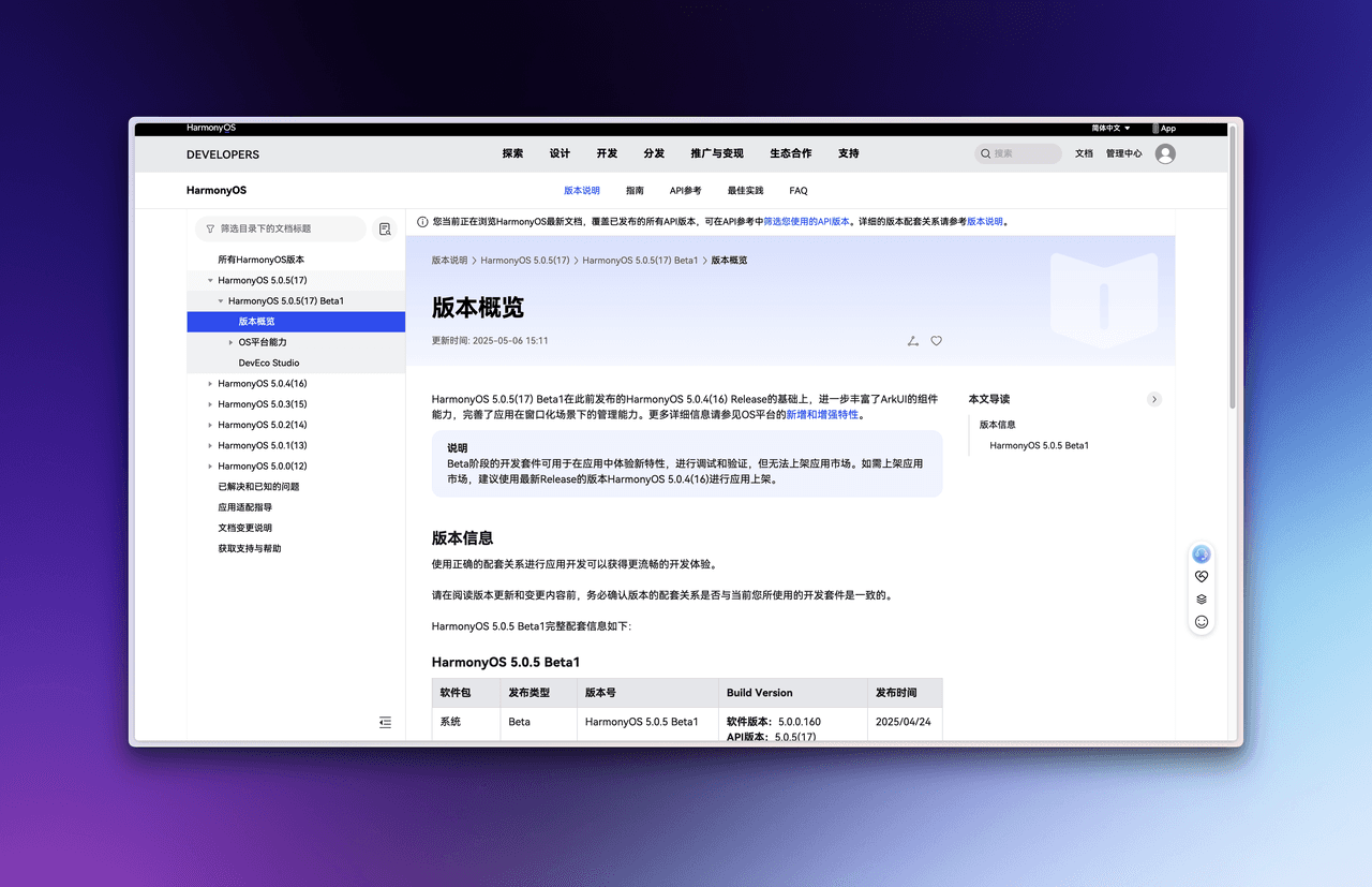 华为鸿蒙 HarmonyOS 5.0.5 (17) Beta1 本次更新重点新增了深度估计等三维感知能力,丰富了 ArkUI 组件和窗口管理,提升了音视频编解码、文件管理、输入法、支付、PDF 加密等多项系统和开发能力,进一步完善了多设备和多场景下的用户体验与开发支持。