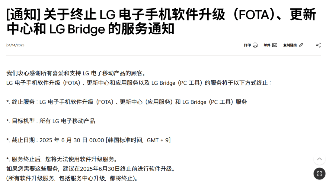 LG 电子于 2025 年 6 月 30 日正式终止其手机相关服务,关闭的服务包括手机软件升级服务(FOTA)、应用更新中心(Application Service)及 PC 端数据管理工具 LG Bridge。此次服务终止影响 LG 电子所有移动产品,将不再提供软件升级服务,不再支持应用更新,初始安装时被删除的基础应用也将无法下载。至于隐私方面,LG 电子表示,为提供服务而收集的个人信息均将在服务终止后立即销毁。但在有关法律法规规定及公司内部规定需要保存的情况下,公司可按照相关法律法规及公司内部规定保存一定期限内的个人信息。