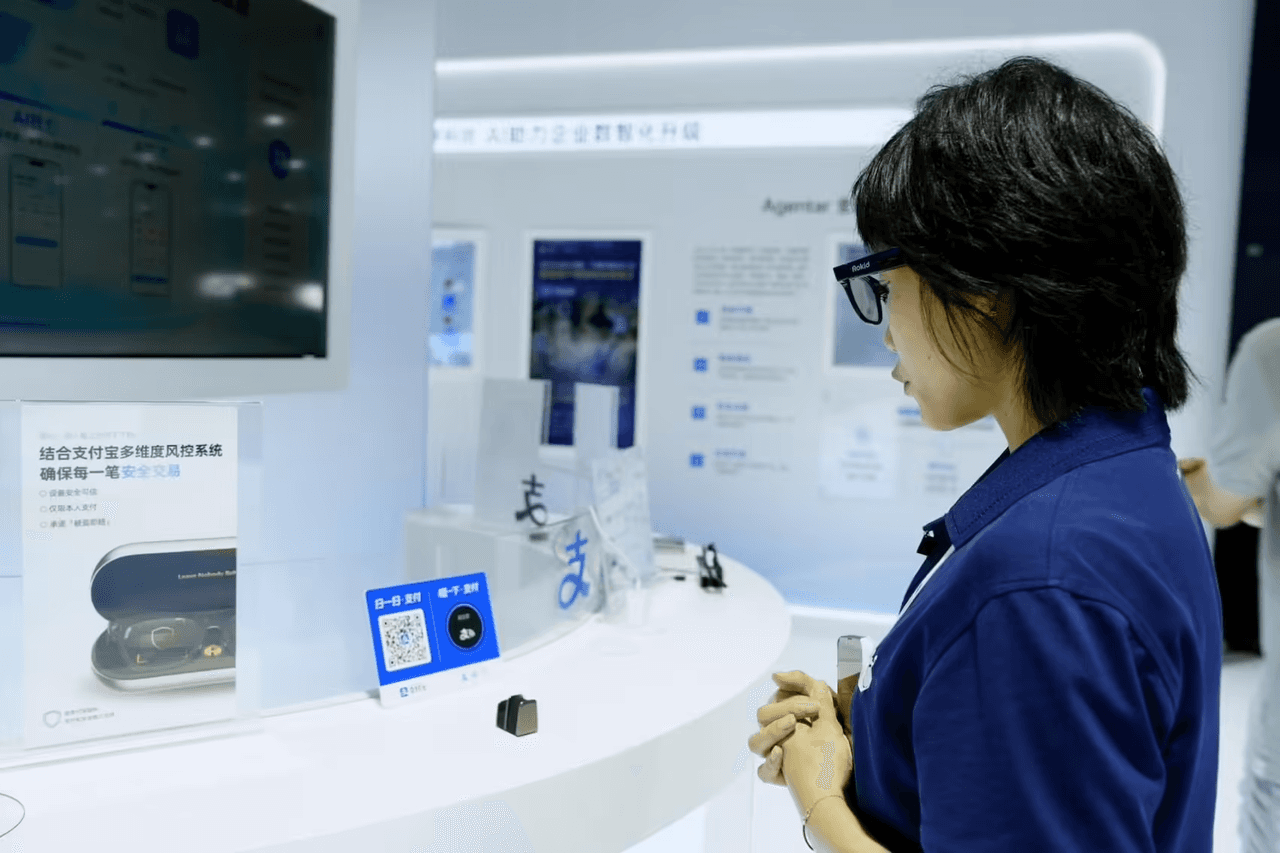 最大亮点就是绑定了阿里自家的生态企业,如高德、支付宝、飞猪等。此前,Rokid 、小米、雷鸟等品牌也联合支付宝展示了可支付的 AI 智能眼镜。现场观众佩戴 Rokid Glasses 后面向支付宝收款码,说一句“乐奇,支付 10 元”,眼镜识别后用户再说一句“确认支付”,即可完成付款,全程不用掏手机。智能眼镜内置了安全机制,具备从设备绑定到支付的全链路安全防护和「被盗即赔」保障。