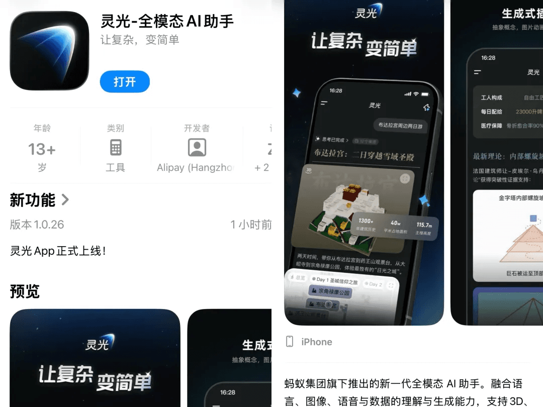 蚂蚁集团正式发布全模态通用 AI 助手「灵光」,以「30 秒生成应用」为核心亮点,现已在 Android 应用商店与苹果 App Store 上线。该产品面向普通用户,旨在提供零门槛的应用开发体验。