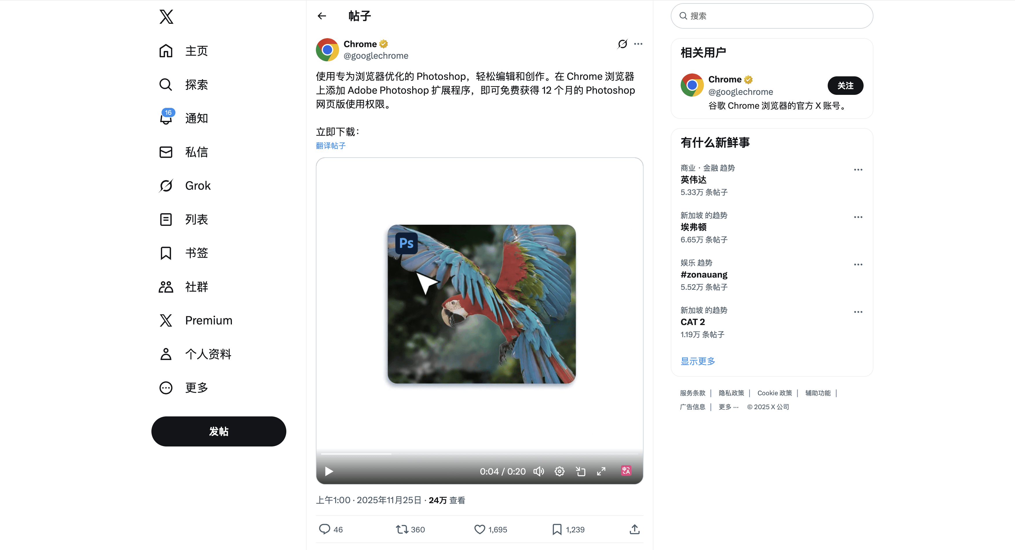 Adobe Photoshop 于 11 月 25 日宣布推出 Chrome 扩展支持,通过该扩展用户可直接在浏览器中执行素材收集、背景移除、精准编辑和裁剪等常用 Photoshop 操作。现在很多工具都采用在线编辑的方式,Photoshop 未来完全在浏览器上编辑也是有可能的。