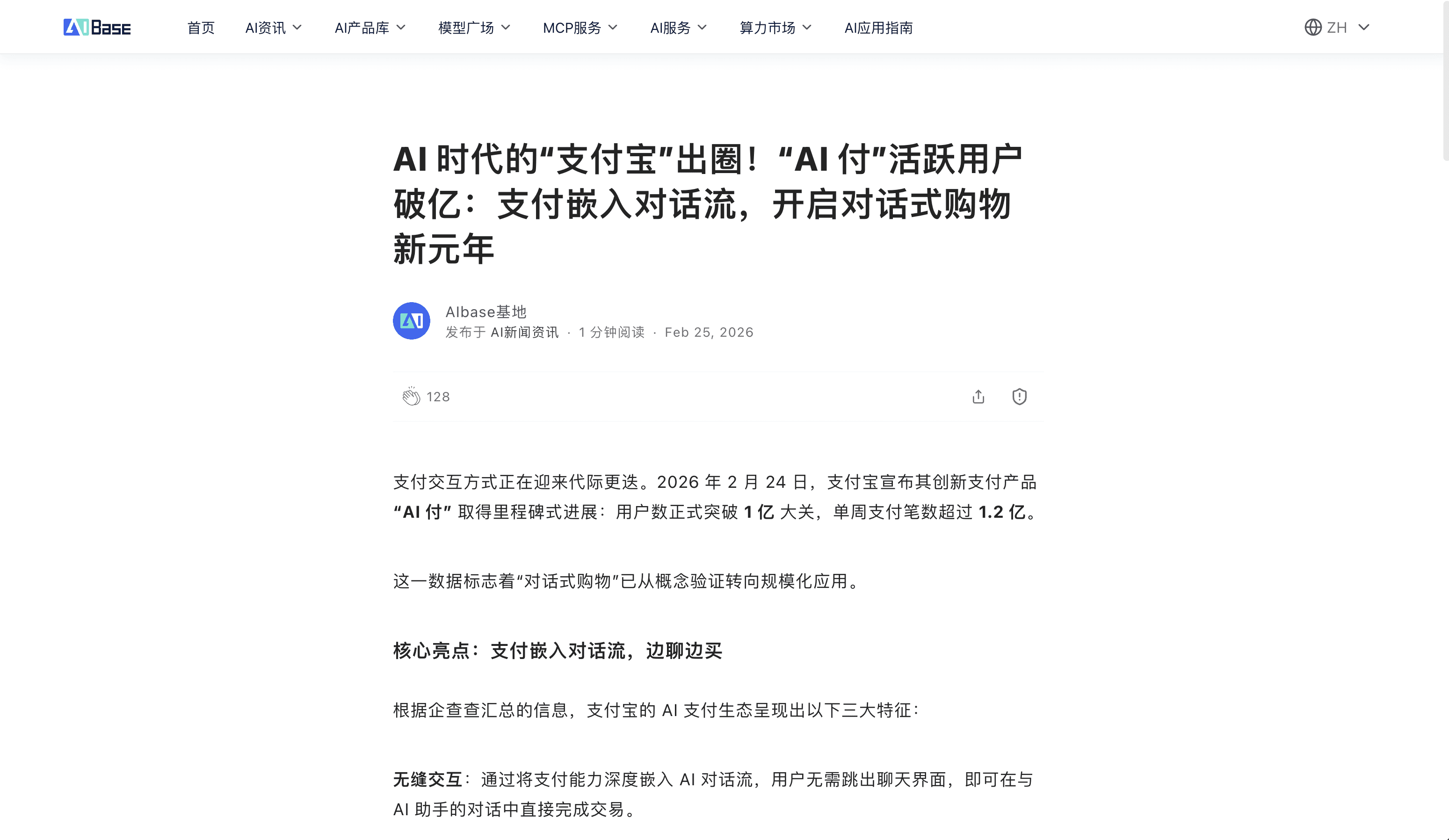 支付交互方式正在迎来代际更迭。2026 年 2 月 24 日,支付宝宣布其创新支付产品 “AI 付” 取得里程碑式进展:用户数正式突破 1 亿 大关,单周支付笔数超过 1.2 亿。