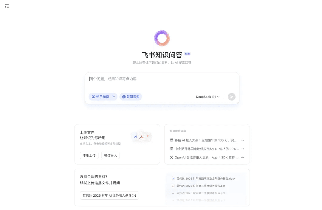 飞书上新了“飞书知识问答”,这是一个基于企业知识的企业专属 AI 问答工具。它能根据用户在飞书上有权限访问的所有聊天消息、协同文档、多维表格、知识库以及各种格式文件等数据,直接给出答案。用户还能借助这个工具,基于企业知识进行内容创作。使用 DeepSeek、豆包、Kimi 等消费级的通用 AI 工具进行提问,得到的回答是基于大模型基础知识以及实时更新的互联网知识,而在飞书端内使用知识问答,当用户选择“使用知识”而不是“联网搜索”,AI 会根据企业内部信息而不是公域互联网信息生成答案。