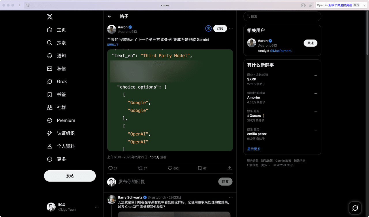 Mac Rumors分析师Aaron Perris发现的代码片段显示,苹果已开始着手为使用 Apple Intelligence 的客户添加 Google Gemini 作为可选的第三方 AI 模型。目前苹果的视觉智能已接入了 OpenAI 的对话模型和 Google 的图片搜索模型,再接入一个 Gemini 也没啥奇怪的,国内版本不知道能不能选择?