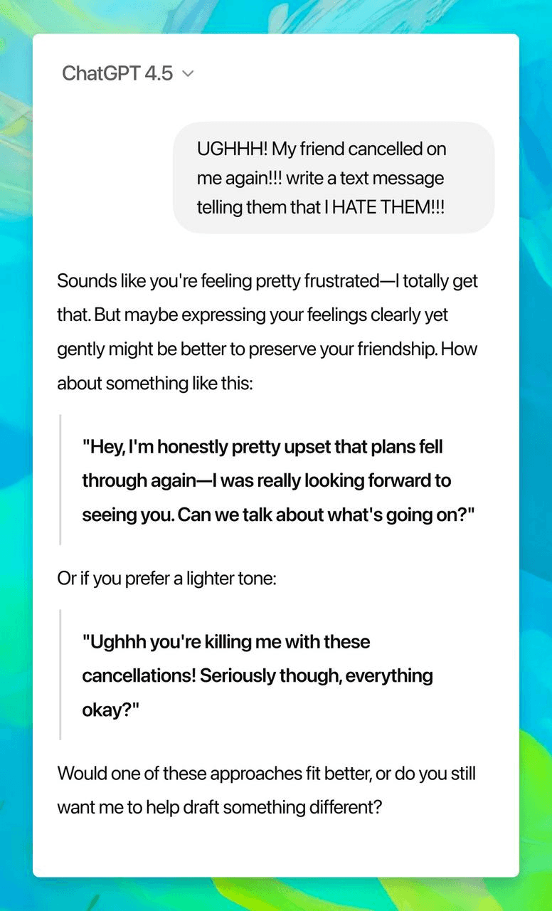 2025 年 2 月 28 号 OpenAI 发布了 ChatGPT4.5 模型,是OpenAI发布的目前为止最大的聊天模型,拥有更大的知识库数据,更强的意图识别能力。据推测,GPT 4.5 的训练使用了 3 万到 5 万块 NVIDIA H100 GPU,训练成本约 7.5 亿到 15 亿美元。OpenAI 真的非常坚决的走在“大”模型上,跟 Deepseek 完全的相反的风格,可能也跟中国传统美德勤俭持家有关吧🐶